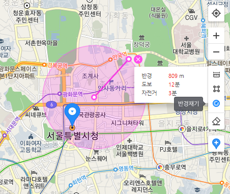 위 사진은 임의의 지역을 선정하여 반경재기를 사용한 예시 사진입니다. 원형의 면적을 표시하는 정보를 얻을 수 있습니다. 최소 방법은 x표시를 선택하는 것입니다.