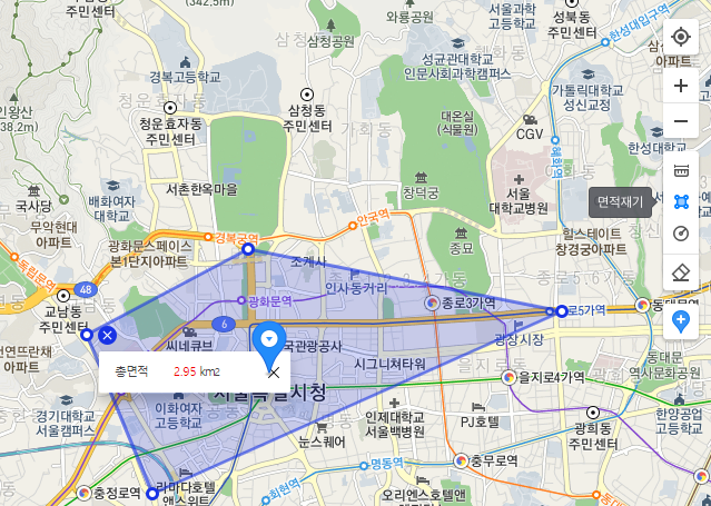 다음 지도에서 면적재기는 거리재기 아이콘 아래에 있습니다. 다각형의 모양으로 정해진 면적에 대한 정보를 얻을 수 있습니다. 아래 사진을 참고하시면 도움이 될 수 있습니다.
