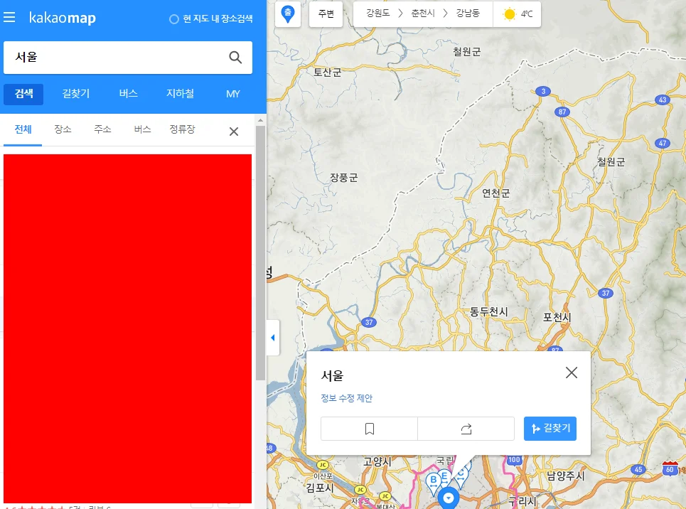 위 사진은 다음 지도에서 지도 검색을 하는 위치의 예시 사진입니다. 해당 검색바를 이용해 지역을 검색할 수 있습니다. 예를 들어 서울을 검색해봅니다.