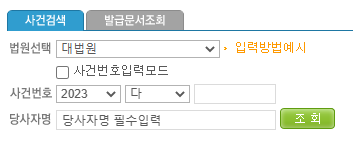 메인 페이지 중간에 있는 사건 검색, 발급문서조회에 관련된 빠른 검색 조회 기능을 제공하는 영역의 예시 사진입니다. 위 모습과 같은 부분을 찾으시면 도움이 될 수 있습니다.