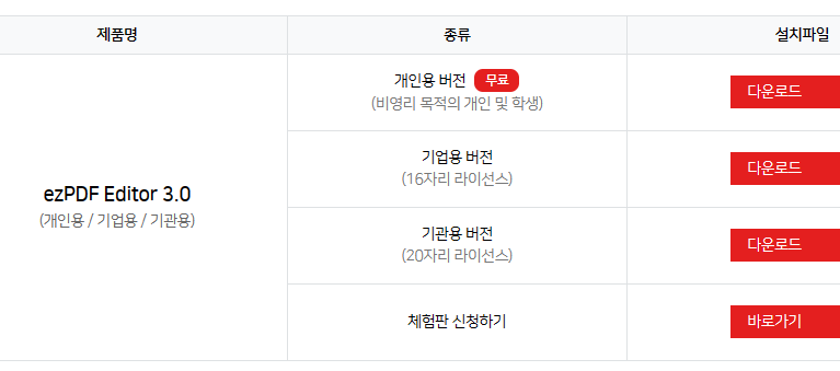ezPDF Editor 3.0은 크게 4가지의 버전으로 구분되어 있습니다. 개인용 버전, 기업용 버전, 기관용 버전, 체험판 신청하기로 구분되어 있습니다. 개인용 버전은 무료로 사용할 수 있습니다. 별도의 버전을 사용하시려면, 사용 조건에 대한 내용을 확인하실 것을 추천합니다.